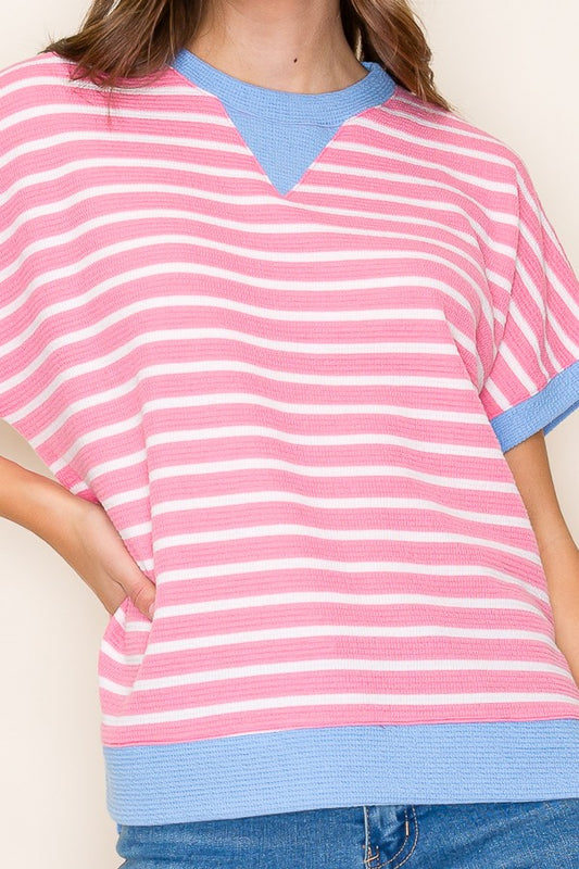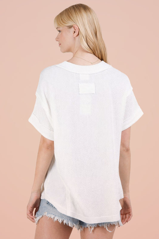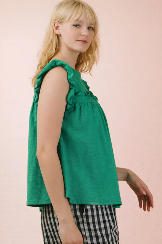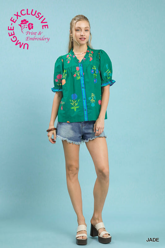 Gingham Bubble Sleeve V-Neck Top w/ Scallop Hem