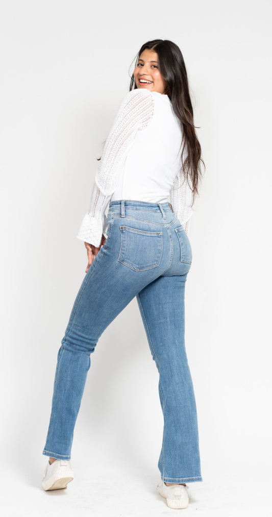 HW Tummy Control Back Pocket Embroidered Bootcut Denim