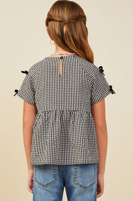 Girls Contrast Ribbon Blue Gingham Babydoll Top