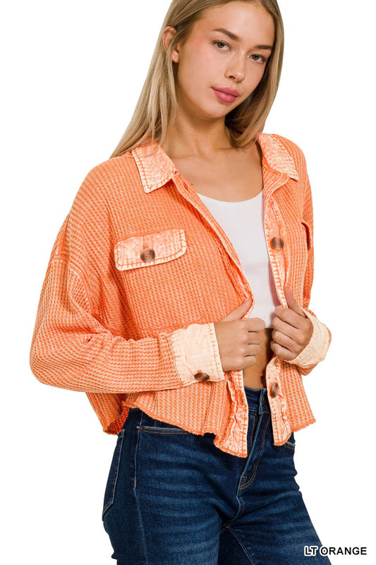 Acid Wash Oversized Cotton Waffle Cropped Shacket