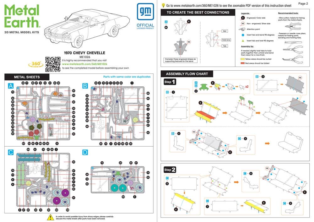 This amazing 3D metal model kit starts as flat metal sheets with intricate details etched onto individual pieces. A set of easy to follow instructions are included and No glue or solder is required. Simply snip out the pieces and bend the tabs through corresponding connection points.The Chevy Chevelle was produced from 1964 through 1977. The creation of the Chevelle Super Sport (SS) in 1966 was an aggressive move by GM to compete against the new powerful Chrysler muscle cars. The 1970 Chevelle SS with its 450 hp engine was ready for drag racing as soon as it rolled off the assembly line.
