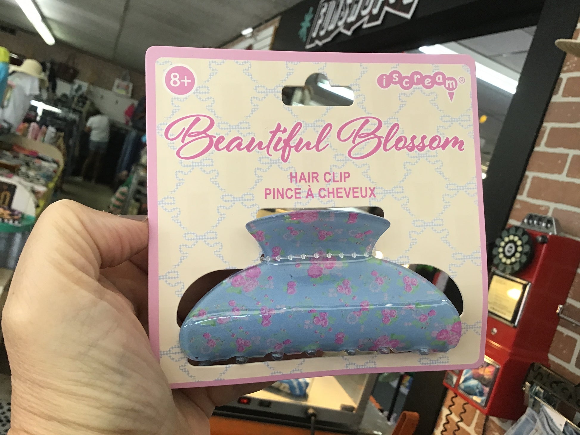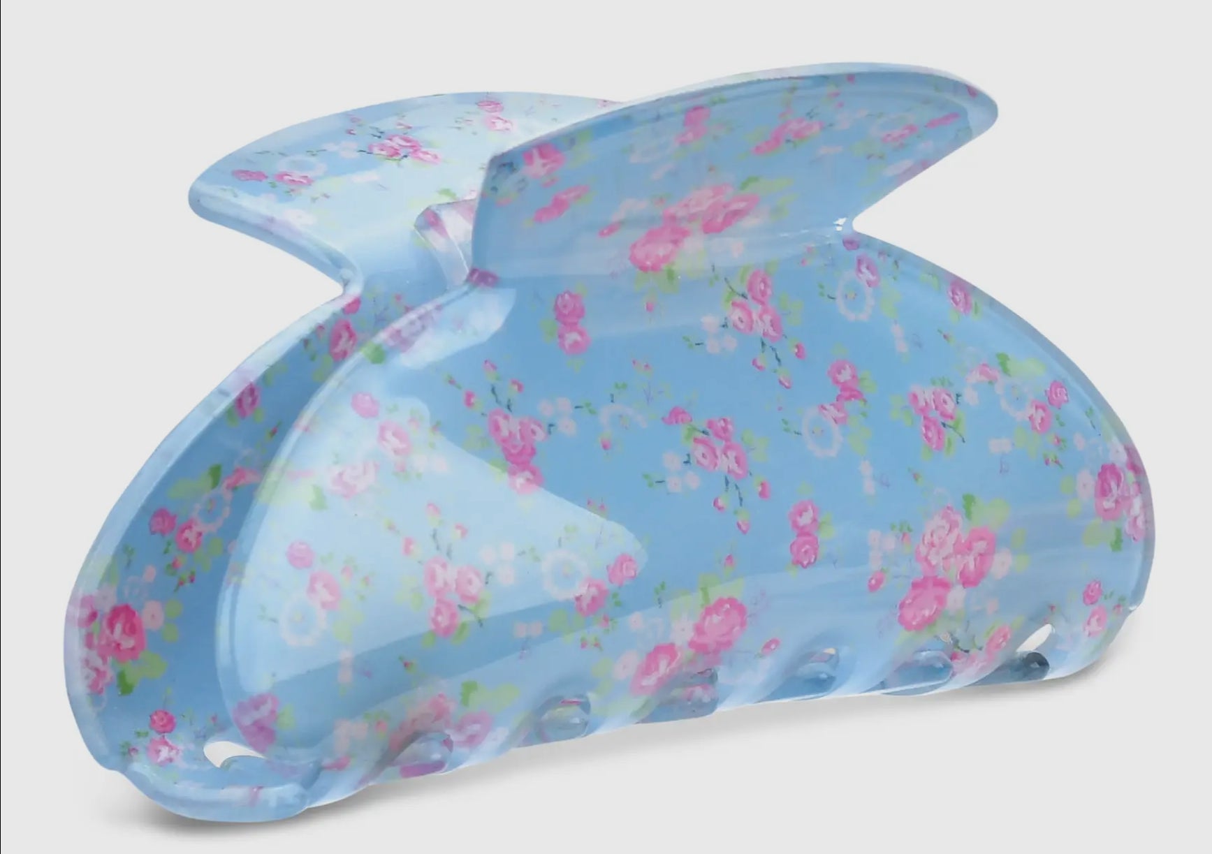 Jump on the trend wagon with us! This beautiful blossom claw clip is the perfect accessory to glow up any outfit. Ditsy flowers in pink on a base of muted blue are the trendiest of trends.