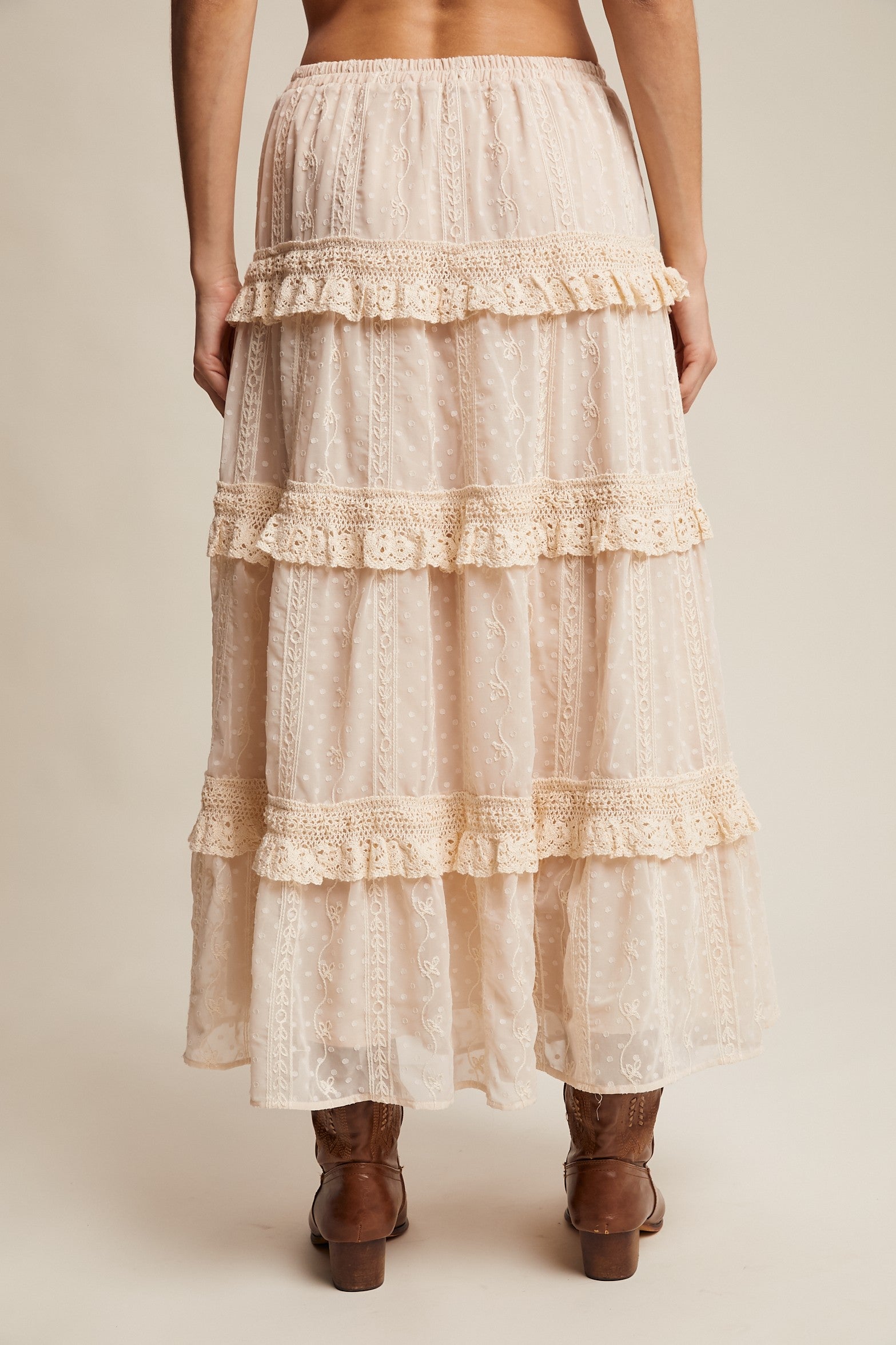 Romantic and effortlessly feminine, this Embroidered Lace Tiered Maxi Skirt features delicate lace detailing and soft tiers that flow with every step. The intricate embroidery adds a vintage-inspired charm, while the maxi length creates a flattering, elongating silhouette. Perfect for dressing up or styling casually with a tucked-in tee.