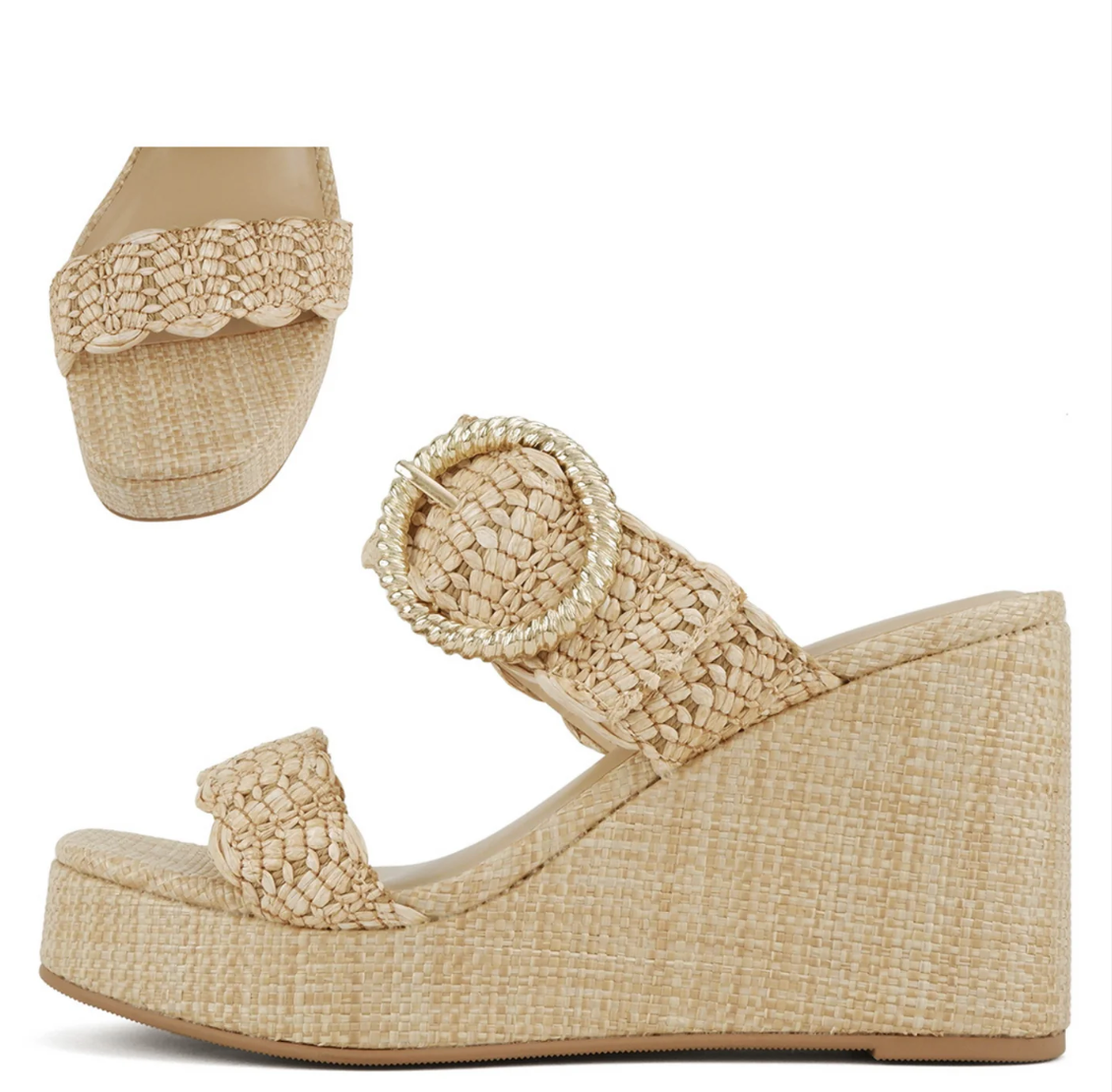 Embrace the chic and effortless elegance of Ilana, the raffia wedge sandals featuring an open toe and buckle detail. Crafted by Soda, these sandals blend fashion with comfort, making them a must-have for any wardrobe. Elevate your style with Ilana and step out confidently.