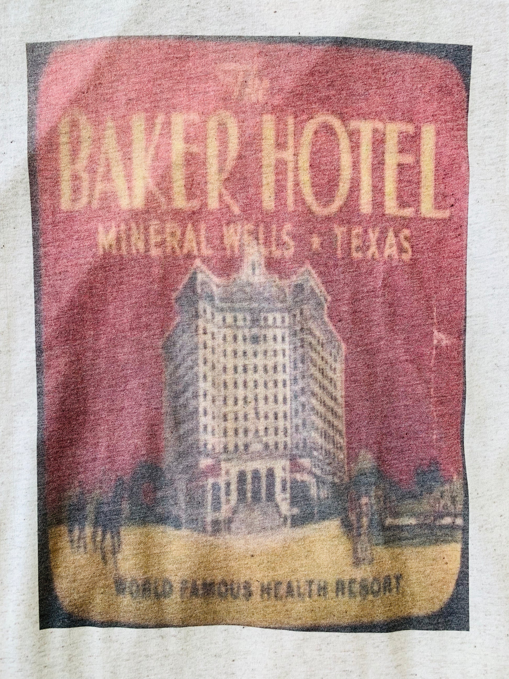 Buttery soft heathered oatmeal tee featuring Mineral Wells' beloved Baker Hotel. This tee says all things vintage!! This is set on an oatmeal Bella+Canvas Tee, a unisex fit tee with a Sublimation print.