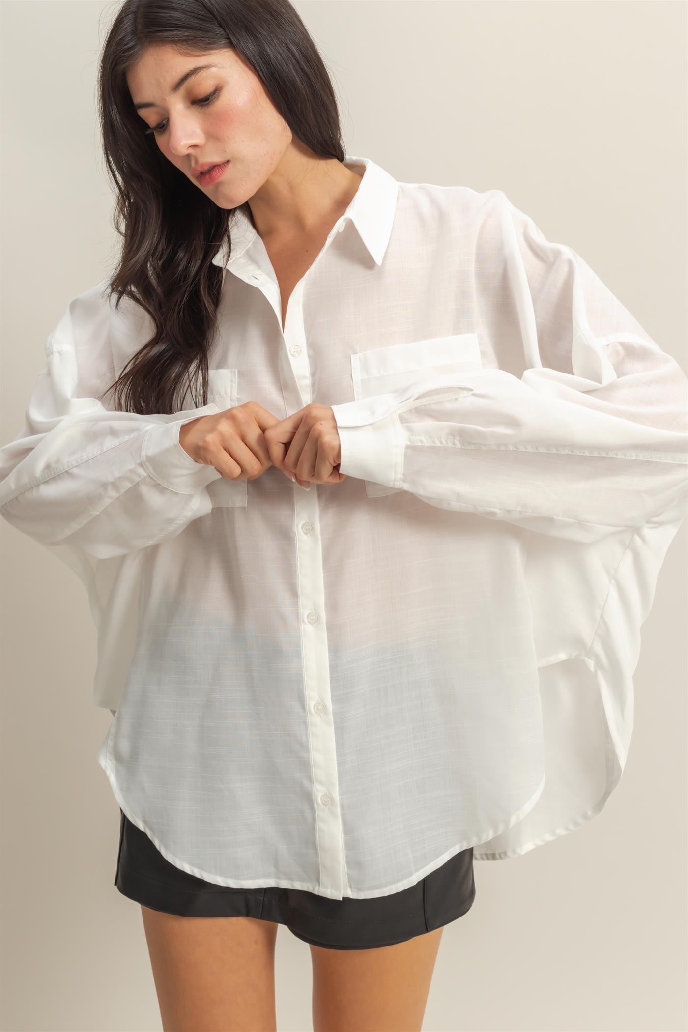 Make a statement in our Oversized Button-Down Shirt—an effortlessly chic piece that’s impossible to forget. The relaxed, oversized fit is highlighted by a classic collar, drop shoulders, and long sleeves, finished with a stylish curved hem. Front patch pockets add the perfect finishing touch to this must-have wardrobe essential. Ideal for a laid-back yet polished look.
