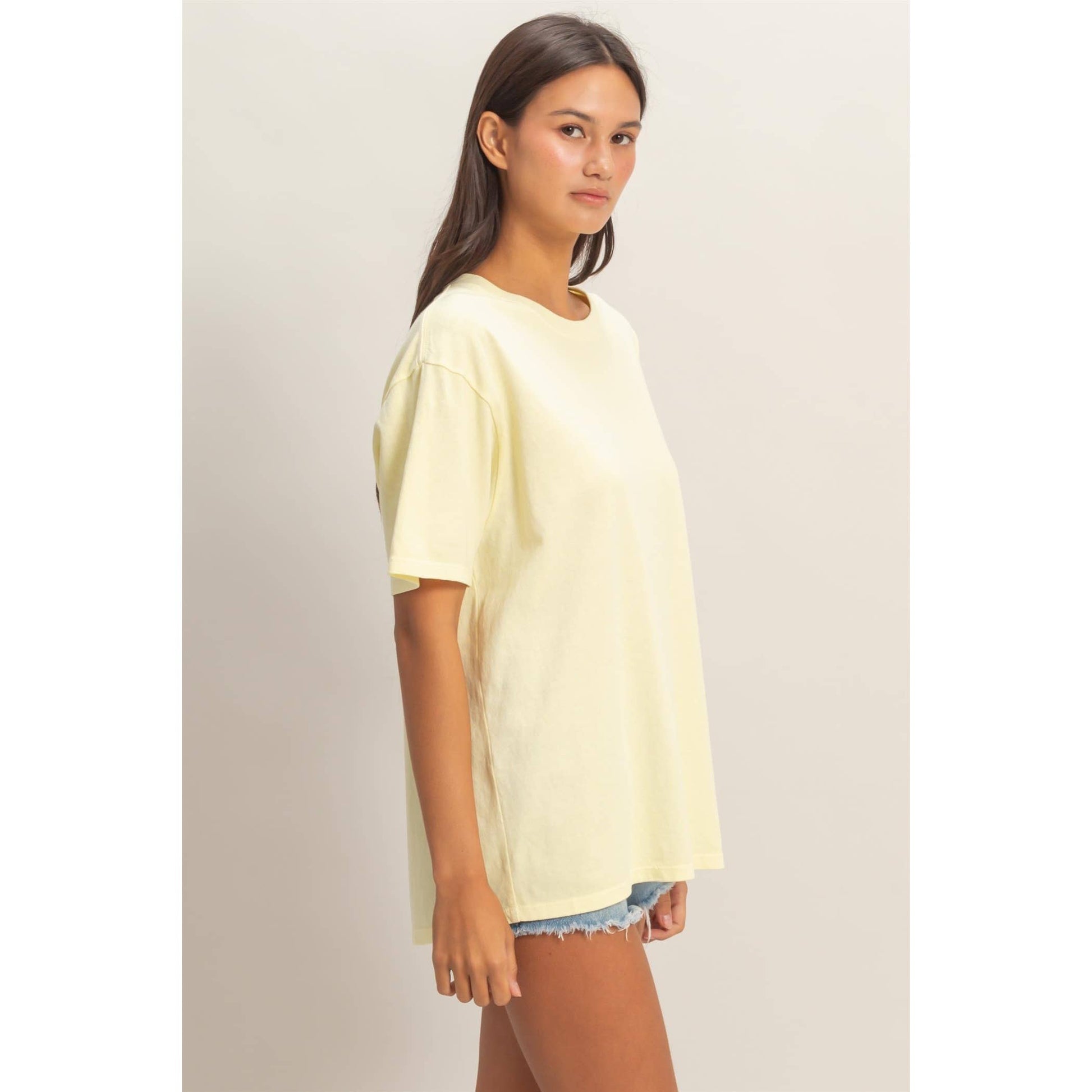 This foundational T-shirt is created from pigment dyed cotton for a rich, slightly faded texture and authentic worn-in look. It features a ribbed crew neckline, comfortable, roomy drop shoulders, and a relaxed, boxy fit. Pair this essential piece with high-waisted denim and sleek sneakers for effortless laid-back vibe.