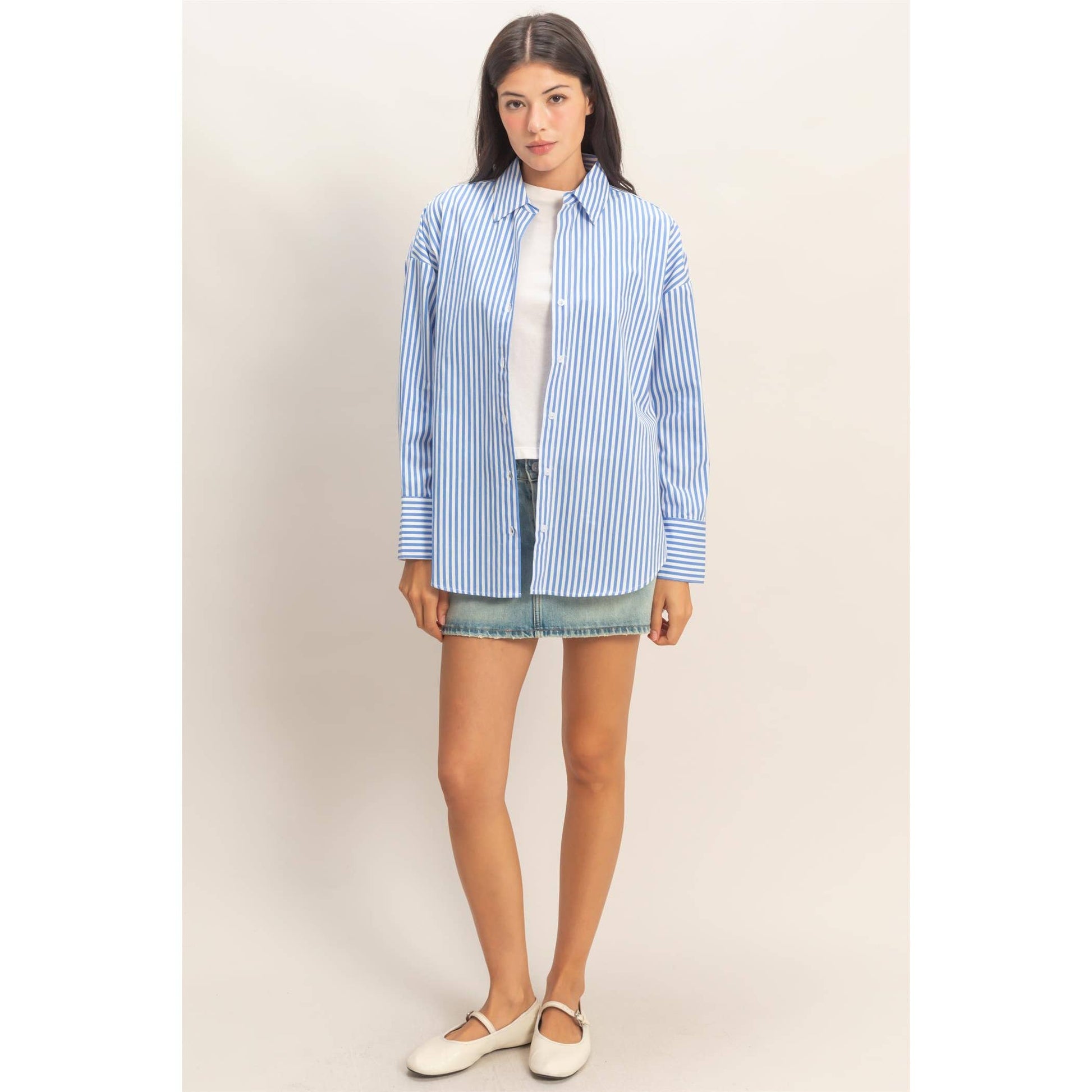 This cotton poplin striped shirt features vertical stripes throughout the body. The design includes a full front button placket, a structured point collar neckline, a curved shirttail hemline, and full long sleeves with extended cuffs that feature horizontal stripes. With an oversized fit and drop shoulders, this pairs well with black trousers.